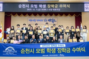 순천시(시장 노관규)는 7일 순천시청 대회의실에서 귀뚜라미문화재단 후원으로 ‘순천시 모범 학생 장학금 수여식’을 개최했다.장학금 수여식에는 장학생 및 학부모 등 70여 명이 참석했으며, 시는 지역 내 국립순천대학교, 청암대학교, 순천제일대학교 3개 대학에서 추천받은 학생 25명에게 각 2백만원씩, 총 5천만원의 장학금과 장학증서를 전달했다.이날 수여식에 참석한 최진민 귀뚜라미그룹 회장은 “학생들이 안정적인 교육 환경에서 학업에 전념할 수 있도록 앞으로도 지역사회와의 협력을 바탕으로 지원을 이어갈 계획이다”며, “귀뚜라미 장학생으로