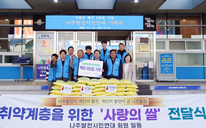 전라남도 나주시(시장 윤병태)는 나주발전시민연대(회장 조충권)가 지난 14일 사회적 취약계층을 돕기 위해 나주시장애인연합회를 통해 장애인단체와 시설에 백미(10kg) 100포를 기탁했다고 17일 밝혔다.17일 나주시에 따르면, 이날 기탁식에는 윤병태 나주시장과 조충권 나주발전시민연대 회장, 임태순 부회장, 회원 등이 참석해 지속적인 나눔 실천의 의미를 함께하며 지역사회 복지 향상에 뜻을 모았다.조충권 나주발전시민연대 회장은 “지역에서 받은 사랑을 어려운 이웃과 나누기 위해 회원들이 마음을 모았다”며 “앞으로도 주변의 어려운 이웃에나