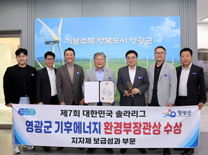 영광군(군수 장세일)은 11월 5일 경기 화성시 정조효공원 야외무대에서 열린 ‘제7회 대한민국 솔라리그(K-Solar League) 시상식’에서 기후에너지환경부장관상을 수상했다고 10일 밝혔다.‘대한민국 솔라리그’는 기후위기대응·에너지전환지방정부협의회, 전국지속가능발전협의회, 한국에너지공단, 한국태양광산업협회, 한국태양광공사협회, 한국RE100협의체가 공동으로 주최해 재생에너지 보급 확대와 탄소중립 실현에 기여한 우수 지자체, 공공기관, 민간 업·단체를 발굴하고 포상하는 전국 규모 대회로 올해 7회째를 맞는다.이번 수상에서 영광군은