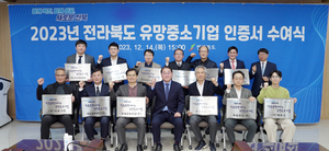 전북도는 지난14일 전라북도경제통상진흥원에서 12개 전라북도 유망중소기업에 인증서와 인증현판을 수여했다.전라북도 유망중소기업은 매년 성장잠재력이 높고 기술·경영·판매력이 우수한 중소기업을 대상으로 각종 평가를 거쳐 선정해 기업 관련 지원을 하는 제도이다.전북도에 따르면, 올해는 49개 기업이 신청해 약 4:1의 경쟁률을 기록했으며, 지난 11월 30일 서류평가, 현장평가, 심층평가를 통해 전라북도 중소기업지원기관협의회의 최종심사를 거쳐 선정됐다.2023년도 전라북도 유망중소기업에 선정된 기업은 ▲내쇼날씨엔디(대표 이준) ▲(주)더젓