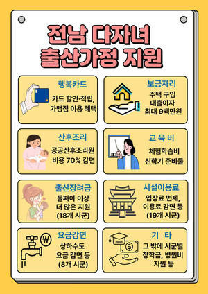 전라남도는 출산율 반등과 인구감소 문제 해소를 위해 다자녀 출산 장려를 위한 맞춤형 지원에 적극 나서고 있다.최근 3년간 전남의 2자녀 이상 다자녀 가구는 2021년 9만 2천680가구에서 2023년 8만 5천815가구로 7% 이상 줄었다. 특히 20~30대의 다자녀 비선호 성향이 뚜렷해 다자녀 출산을 위한 종합대책이 절실하다.이에 전남도는 다자녀 출산을 장려하기 위해 지원사업 52건(도 5·시군 47), 시설할인 74건(도 8·시군 66) 등 총 126건의 사업을 추진한다.다자녀 가정이 주택을 구매하면 월 최대 25만 원의 대출이