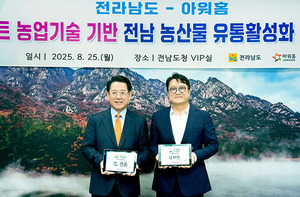 전라남도와 한화 아워홈은 25일 도청에서 ‘스마트 재배관리 솔루션’을 적용한 농산물의 안정적 생산과 유통 활성화를 위한 업무협약(MOU)을 했다.25일 전남도에 따르면, 협약식에는 김영록 전남도지사, 김태원 한화 아워홈 대표이사, 김행란 전남농업기술원장, 박현식 전라남도 농축산식품국장 등이 참석했다.주요 내용은 ▲스마트 재배관리 솔루션 도입과 기술 지원을 통한 농산물 안정 생산 ▲대형 유통업체와의 협력을 통한 판로 확대 ▲산지 가공시설과 맞춤형 소포장 기반 구축 등이다.협약은 전남도에서 개발한 노지 스마트팜 기술을 활용해 기후변화와