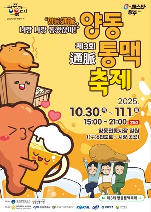 100년 역사를 자랑하는 양동전통시장 고유의 맛과 멋을 즐기는 ‘아주 특별한 미식관광형 축제’인 제3회 양동통맥축제가 오는 30일 막을 올린다. 광주광역시 서구(구청장 김이강)는 30일부터 11월1일까지 3일간 양동전통시장 구6번로와 태평교 일대에서 모든 세대가 소통하는 양동통맥축제를 개최한다고 밝혔다.이번 축제는 ‘양동통맥(通脈), 너랑 나랑 통했잖아!’라는 주제로 전통시장과 시민이 소통하고 세대가 어우러지는 미식문화의 장으로 마련됐다. 축제는 매일 오후 3시부터 9시까지 진행되며 개막식은 30일 오후 5시 지역 예술팀의 공연으로