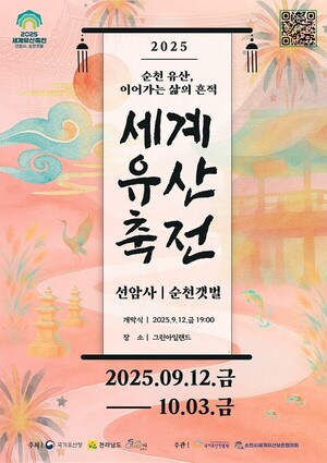 순천시(시장 노관규)와 순천시 세계유산보존협의회(위원장 김준선)가「2025 세계유산축전 선암사, 순천갯벌」의 출발과 성공을 다짐하는 Kick-off 워크숍을 오는 9일 14시에 문화건강센터 다목적홀에서 진행한다고 밝혔다.이번 워크숍은 세계유산보존협의회 위원, 세계유산축전 사무국, 프로그램 운영 대행사, 시민 공모 프로그램 참여자, 순천시 국가유산과 등 100여명이 참석하며 성공 다짐 퍼포먼스, 2025 세계유산축전 브리핑, 안전교육, CS(친절) 교육, 참여자 네트워킹 순으로 진행된다.세계유산축전 참여자들의 축전 이해도를 높이기 위
