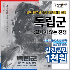 전라남도 강진군이 광복 80주년을 맞아 순국선열들의 희생과 독립 정신을 기리기 위한 다큐멘터리 영화 ‘독립군-끝나지 않은 전쟁’을 특별상영한다. 이번 상영은 20일부터 2주간 1일 1회씩 진행된다.강진군에 따르면, 영화 ‘독립군’은 일제강점기 암울한 시기에 조국 독립을 위해 목숨을 바친 독립군의 치열한 투쟁과 삶을 담아낸 작품으로, 역사적 사실과 감동적인 증언을 통해 관객들에게 큰 울림을 전한다.특히 이번 상영은 강진군민 누구나 1천 원에 관람할 수 있도록 마련돼, 광복의 의미를 되새기고 세대 간 공감과 소통의 장이 될 것으로 기대