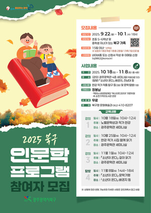 광주시 북구(구청장 문인)가 한강 작가의 노벨문학상 수상을 계기로 높아진 주민들의 인문학적 관심을 충족하고 독서문화를 확산하기 위해 올해 처음 마련한 ‘인문학 프로그램’을 본격 추진한다고 18일 밝혔다.이번 프로그램은 한강 작가의 『소년이 온다』를 중심으로 전문가 강의와 소설 속 배경지를 탐방하는 문학기행으로 구성됐다.먼저 10월 18일부터 11월 1일까지 광주문학관에서 정봉남 前 순천기적의도서관 관장을 강사로 하는 ▲노벨문학상과 작가 한강 ▲한강 작가 시집 읽기 ▲소년이 온다 깊이 읽기 등 3회차의 강의가 제공된다.회차별 강의 이