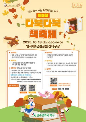 광주시 북구(구청장 문인)는 오는 18일 오전 10시부터 일곡제1근린공원과 일곡도서관 일대에서 ‘다북다북 책축제’를 개최한다고 13일 밝혔다.‘다북다북 책축제’는 주민들의 독서문화 활성화를 위해 지난 2021년부터 매년 추진해오고 있는 주민참여형 문화 행사이다.‘책과 함께 여는 북적북적한 하루’라는 주제로 열리는 올해 축제는 지역 내 도서관·독서단체·마을공동체 등 15개의 기관·단체가 함께 참여해 풍성함을 더할 예정이다.행사 당일에는 ▲공연 ▲체험 ▲동화 ▲놀이 ▲전시 ▲쉼 등 총 6개의 마당으로 구성된 다채로운 프로그램이 펼쳐져