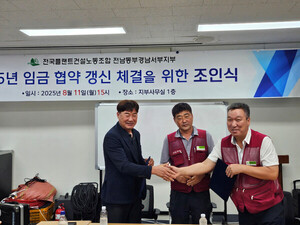 광양시(시장 정인화)는 지난 8월 11일 관내 플랜트건설노조와 광양제철산업단지전문건설인협의회 간 2025년 임금협상이 무분규로 원만히 타결됐다고 밝혔다.이번 합의에는 전 직종 근로자의 6,500원 임금 인상안이 포함됐다. 조인식은 플랜트건설노조 전남동부경남서부지부 사무실에서 열렸으며, 전국플랜트건설노조 이주안 위원장, 전국플랜트건설노조전동경서지부 안영일 지부장, 광양제철산업단지전문건설인협의회 안영일 회장, 김주현 부회장 등 노사 양측 주요 관계자 20여 명이 참석했다. 이들은 상호 신뢰를 바탕으로 한 협력 의지를 재확인하고, 무분규