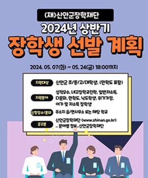 (재)신안군장학재단은 오는 5월 7일부터 5월 24일까지 2024년 상반기 신안군 인재육성 장학금 신청을 받는다.30일 신안군에 따르면, 선발 분야는 3개 분야 8종이다. ▲우수장학생 ▲내고장학교진학 ▲일반저소득 ▲만학도 ▲다문화가정 ▲낙도학생 ▲위기가정 ▲어가 및 저소득 장학생을 선발해 총 2억 1,420만 원을 지원한다.대상자는 공고일 기준 학생 본인과 보호자가 6개월 이상 신안군에 주소를 둔 초등학생부터 대학생까지다. 다만, 대학생은 보호자의 주소 기준(6개월 이상)이 충족되면서 학생 본인은 공고일 기준 신안군에 주소가 있으면