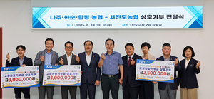 전남 진도군은 지난 8월 19일(화) 진도군청에서 서진도농협, 나주시 영산포농협, 화순군 이양청풍농협, 함평군 손불농협과 손을 맞잡고 고향사랑기부제 상호 기부금 전달식을 개최했다고 밝혔다.진도군에 따르면, 이번 상호 기부는 지역 공동체의 발전과 고향사랑 실천, 지역 상생 발전을 위해 각 지역의 농협이 뜻을 모아 추진됐다.기부금 전달식에는 김희수 진도군수를 비롯해 엔에이치농협(NH농협) 황지연 진도군지부장, 강성민 서진도농협 조합장, 재해중 나주시지부장, 장행준 영산포농협 조합장, 최우영 화순군지부장, 안상섭 이양청풍농협 조합장, 곽