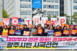 경제주권 수호! NO트럼프 광주시민긴급행동(이하,광주시민긴급행동)은 광주광역시 28일 오전 11시 동구 5.18민주광장에서 긴급 기자회견을 열고 정부는 미국의 강압적 투자 요구를 거부하고 국민의 생존권을 자켜야 한다.고 강조했다.28일 오전 11시 5.18민주광장 시계탑 앞에서 열린 긴급회견에는 현지스님, 최영태 전) 전남대교수, 조영대 신부, 이신 광주평화연대 집행위원장 등 회원 100여명(전체회원 500명)이 자리를 함께했으며, 광주시민긴급행동은 “내일 열리는 한미정상회담에서 정부는 미국의 일방적 투자 압박에 서명하지 말고 국가