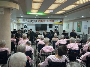 광주광역시 소방안전본부는 10일 북구 생용동 패밀리전문요양원·한울요양원에서 ‘광주소방악대 찾아가는 음악회’를 열고, 어르신들에게 따뜻한 위로와 감동을 전했다.이날 공연에서 광주소방악대원들은 50여명의 어르신들을 위해 클라리넷·플루트·색소폰·베이스 등으로 구성된 앙상블 무대를 꾸며 총 9곡을 연주했다. 생동감 넘치는 선율에 어르신들은 환한 미소로 화답하며 즐거운 시간을 보냈다.한 요양원 관계자는 “생동감 있는 연주 덕분에 어르신들이 활기를 되찾았다”며 “뜻깊은 시간을 마련해준 광주소방악대에 감사드린다”고 말했다.최병복 광주소방악대장은