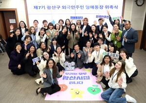 광주 광산구(구청장 박병규)가 지난 3일 2층 회의실에서 제7기 외국인주민 명예통장단을 위촉했다.제7기 광산구 외국인주민 명예 통장은 지난 3월 공개모집과 심사를 통해 최종 14개국 24명의 외국인 주민이 선정됐다.외국인주민 명예통장은 지난 2013년 전국 최초로 광산구가 시행했으며, 해마다 급증하는 이주민과 양방향 소통을 하고, 이주민들이 사회 구성원으로서 지역사회에 잘 정착할 수 있도록 돕기 위한 제도다.이번 모집에는 14개국 38명이 지원했으며, 심사를 통해 출신국별로 최대 4명까지 선발했다.외국인주민 명예통장단은 앞으로 2년