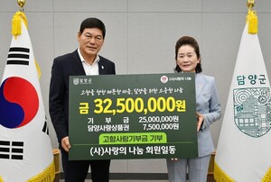담양군(군수 정철원)은 2일 일본 자원봉사단체 (사)‘사랑의 나눔’ 회원 일동이 집중호우 피해 복구를 위해 무정면에 고향사랑기부금 2천5백만 원을 지정 기탁했다고 밝혔다.담양 무정면 출신 재일 사업가 김운천 씨가 회장을 맡고 있는 (사)‘사랑의 나눔’은 회원 400여 명이 활동하는 자원봉사단체로, 세계 여러 나라의 보육원 지원 등 다양한 활동을 이어오고 있다.이날 기탁식에는 김운천 회장을 비롯해 회원 15명이 함께해 기부금을 전달했다. 또 고향사랑기부 답례품인 담양사랑상품권 750만 원을 추가로 기부해, 폭우 피해 가구 75곳에 1