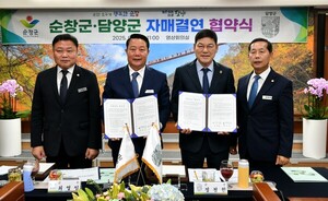 전라남도 담양군(군수 정철원)과 전북특별자치도 순창군(군수 최영일)은 9일 순창군 영상회의실에서 자매결연 협약을 맺고 상생발전과 우호교류 강화를 약속했다.협약식에는 정철원 담양군수, 최영일 순창군수, 장명영 담양군의회 의장, 손종석 순창군의회 의장을 비롯한 20여 명이 참석했다.이날 양 지자체는 행정, 관광, 문화, 예술 등 지역사회 전반에서 능동적 협력 체계를 구축하고 민간교류 활성화를 통해 미래 발전을 다짐했다.정철원 담양군수는 “오랜 시간 구곡순담 장수도시로 협력해 온 순창군과 자매결연을 하게 되어 기쁘게 생각한다”며 “양 도