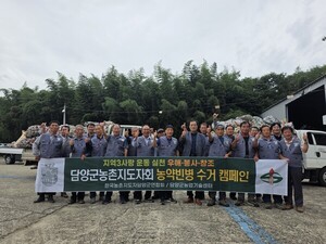 담양군은 한국농촌지도자담양군연합회(회장 방해원)가 12일 회원 30명과 함께 농약 빈병 수거 및 탄소중립 실천 캠페인을 진행했다고 밝혔다.이날 행사는 수북면 대방리에 있는 한국환경공단 담양사업소에서 열렸으며, 참석자들은 폐농약 용기 분리배출 교육을 받고 기후변화 대응을 위한 결의 캠페인도 함께 했다.현장에는 한국농촌지도자전라남도연합회 최원섭 부회장을 비롯한 임원들이 참여해 활동을 격려했고, 깨끗한 담양군 경관 조성을 위해 지역 농촌지도자들이 앞장설 것을 당부했다.농촌지도자담양군연합회는 2021년부터 매년 농약 플라스틱병 분리배출과