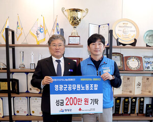 지난 17일 제10기 영광군 공무원노동조합(위원장 박종옥)은 어려운 이웃을 위해 사용해 달라며 ‘희망이 모이는 영광곳간’에 후원금 200만 원을 기탁하였다.영광군 공무원노동조합은 제10기 임원진을 새로 선출하고 지난 1월 9일 출범식을 개최할 예정이었으나 제주항공 여객기 참사로 지역사회 아픔을 함께하고자 출범행사를 취소하였다.그동안 노조는 공직사회 개혁을 통한 새로운 노동문화를 창출하고 조합원의 권익을 보호하며, 사회적 지위 향상을 위해 꾸준히 노력해 왔다. 또한, 2014년부터 지역의 소외계층을 위한 생필품(화장지, 라면, 이불
