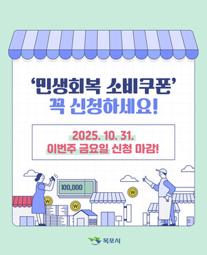 목포시가 ‘2차 민생회복 소비쿠폰’의 신청 기한이 오는 31일(금) 오후 6시로 마감된다고 밝혔다.목포시의 2차 소비쿠폰은 10월 28일 기준 총 19만여건 97.3%가 신청·지급됐다.시는 신청 마감이 임박함에 따라 미신청 시민이 혜택을 놓치지 않도록 신청마감을 홍보하고 ‘찾아가는 신청 서비스’ 운영에 행정력을 집중하고 있다.특히 온라인 신청이 어렵거나 거동이 불편한 고령자, 장애인 등 사회적 약자를 위해 동 행정복지센터에서 직접 가정을 방문해 신청서 작성과 절차를 안내하고 있다.1차와 2차 소비쿠폰의 사용기한은 모두 11월 30일