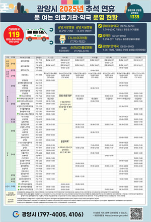 광양시(시장 정인화)는 시민과 귀성객들이 안전하고 편안하게 명절을 보낼 수 있도록 오는 10월 3일부터 9일까지 7일간 ‘추석 연휴 종합상황실’을 운영한다고 밝혔다.추석 연휴 종합상황실은 생활민원기동반, 재난상황반, 진료대책반 등 총 6개 반으로 편성되며 266명의 인력이 투입된다. 시는 각종 비상 상황에 신속하고 체계적으로 대응함으로써 시민들의 생활 불편을 최소화하고 안전을 확보할 계획이다.생활민원기동반은 환경, 도로, 교통, 수도, 쓰레기 수거, 가로등 등 일상과 직결된 민원을 집중 처리해 연휴 기간 발생할 수 있는 불편을 신속