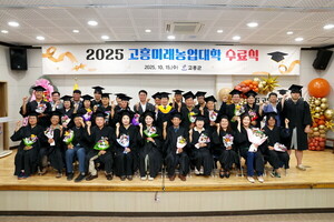 고흥군(군수 공영민)은 15일 농업기술센터 대교육장에서 ‘2025년도 고흥미래농업대학 수료식’을 개최하고, 지역 농업의 미래를 선도할 전문농업인 36명을 배출했다.이날 수료식에는 공영민 군수를 비롯해 학사운영위원, 관계 공무원 등 50여 명이 참석했으며 ▲학사운영 보고 ▲수료증 수여 ▲군수 축사 ▲학생대표 소감문 낭독 ▲기념촬영 순으로 진행됐다.고흥미래농업대학은 2008년 제1기를 시작으로 올해 18기를 맞았으며, 지금까지 총 1,126명의 전문농업경영인을 배출했다. 올해는 ‘농업CEO반’을 개설해 생산을 넘어 기획·가공·유통까지