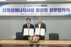 고흥군(군수 공영민)이 여수문화방송(사장 이호인)과 지역의 신재생에너지 활성화와 친환경 에너지 산업 육성을 위해 손을 맞잡았다.양 기관은 21일 상호 협력을 위한 업무협약(MOU)을 체결하고 ‘신재생에너지사업 협력체계’를 구축하기로 했다.이번 협약은 군이 추진하는 친환경 에너지 산업 육성과 지역경제 활성화라는 목표 아래, 신재생에너지 분야에서 양 기관이 적극 협력하기로 했다는 점에서 큰 의미가 있다.특히, 양 기관은 군이 중점 추진하는 해상풍력을 비롯한 다양한 신재생에너지 정책과 사업을 홍보해 지역 주민의 인식을 높이고 사업 참여를