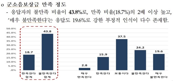 현 군 소음 피해보상금에 대해 ‘불만족스럽다’는 응답이 43.8%(불만족 24.2%, 매우 불만족 19.6%)로, ‘만족한다(18.7%)’의 2배를 넘었다.
